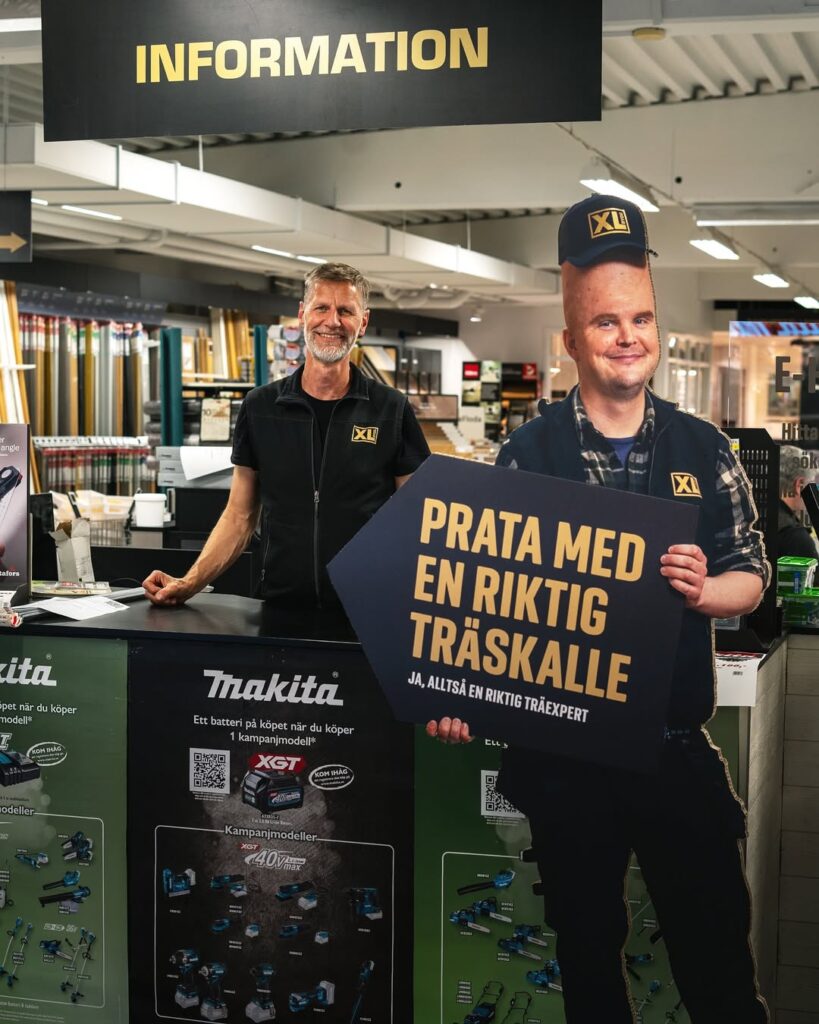 I mars 2025 spelade jag huvudrollen i en reklamkampanj för XL Bygg. Jag hade på mig en huvudprotes för att ge karaktären ett högt huvud (en ”träskalle”).